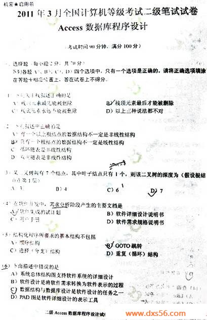 2011年3月计算机等级考试二级Access技术笔试真题(图片版),标签:计算机二级考试真题,计算机二级考试试题,http://www.dxs56.com